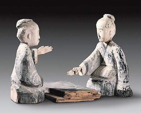 出土于西漢晚期48號(hào)墓的六博俑,包括一件棋盤、兩件俑。棋盤長29.2厘米,寬19.3厘米,呈長方形,黑色涂底,上面繪有白色“規(guī)矩紋”圖案,好似棋格;木俑高28.5厘米,為兩位跪坐相向?qū)牡睦夏昴行浴I碇荫砰L袍,梳圓髻,留胡須,全身以黑白為主色。
