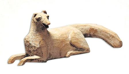 狗俑長度在14-24厘米左右。先雕刻出輪廓,墨色線條勾出眼、耳及身上的毛發(fā),造型多樣,且以臥木狗俑較多,雙耳豎立,頭搭在前伸的雙腿或前爪上。這其中不僅有原木色作底、墨線勾勒的臥姿木狗俑,還有通體施白漆,墨線描繪耳、嘴、眼、前爪及背部、尾部的鬃毛,雕刻成分甚少,無任何肢體動(dòng)作,卻唯獨(dú)將雙耳豎起,展現(xiàn)警覺性的臥姿木狗俑。