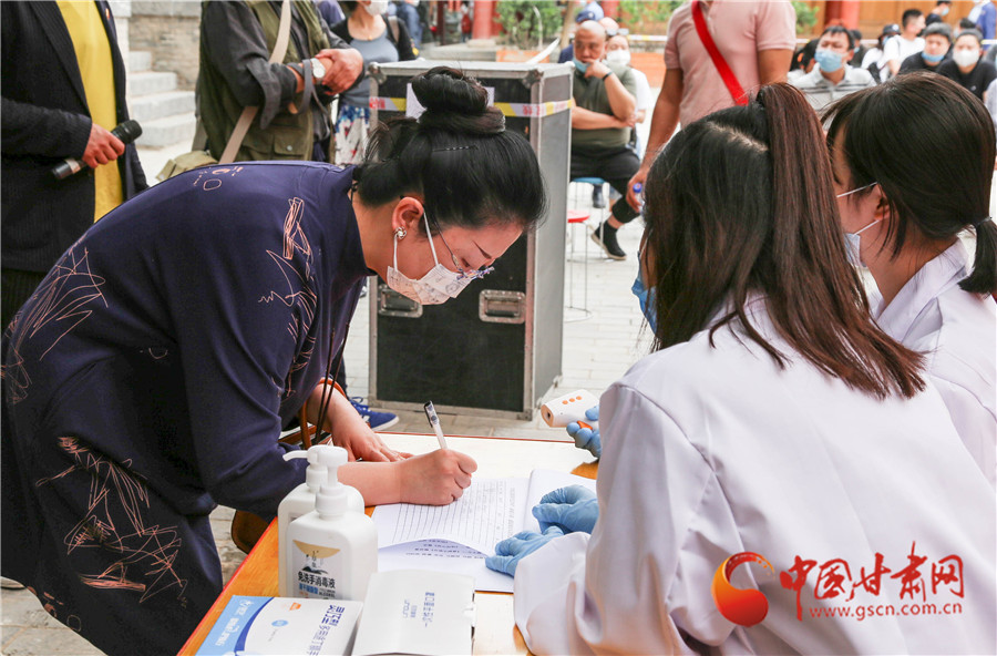 觀看演出人員在隍廟門口掃描“健康碼”,經(jīng)工作人員驗證、測溫、登記后予以放行入場。演出場地人數(shù)達(dá)到150人之后,不再放行。所有觀看演出人員在工作人員引導(dǎo)下佩戴口罩、間隔就坐,保持1米以上距離。演出人員在臺上臺下也保持一定距離。