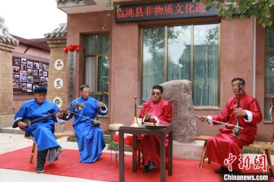 10月12日,甘肅省定西市臨洮縣舉行非物質(zhì)文化遺產(chǎn)展示中心啟動儀式。圖為當(dāng)?shù)仄び皯騻鞒腥粟w學(xué)兵(右二)帶領(lǐng)班社表演影子腔?!堟?nbsp;攝