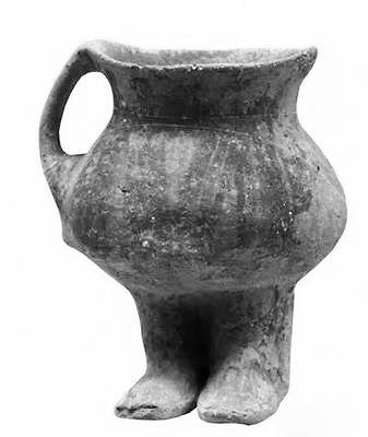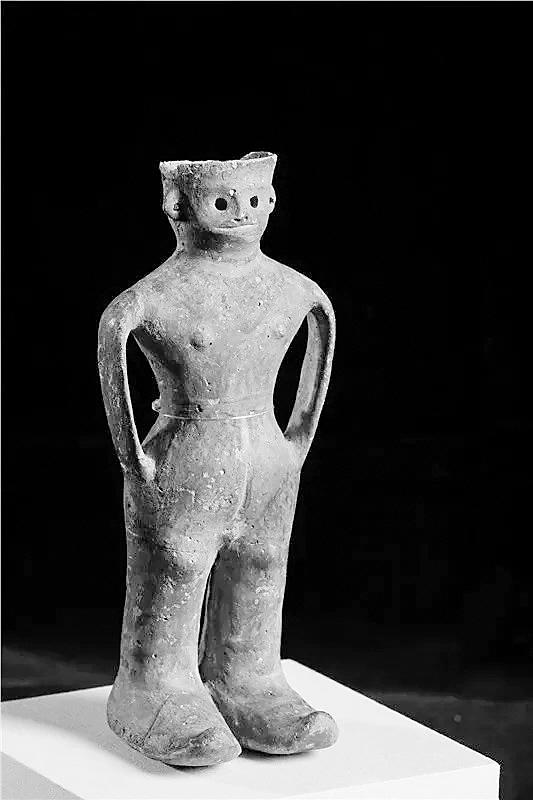 最特別的就是他雙腳上的鞋子,看上去完全是一雙高腰靴子,而且腳型巨大。陶器人體中空,可以盛水,插入褲兜的雙臂形成陶罐的雙耳,設計十分大膽精巧。