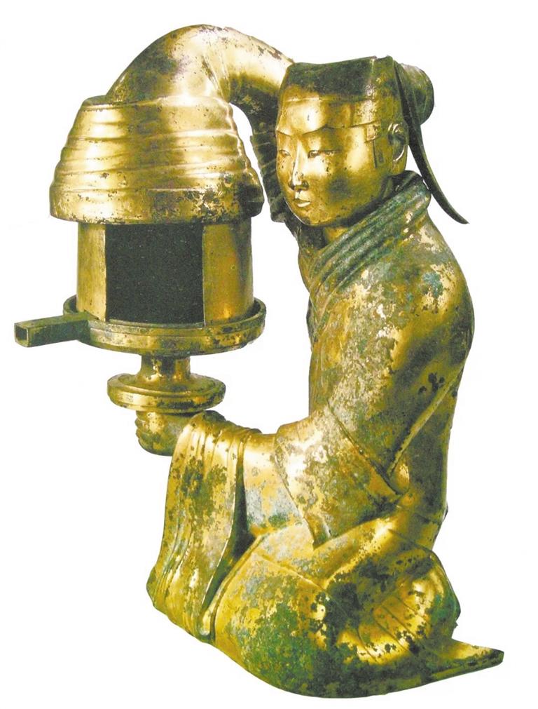 沒錯(cuò),長信宮燈最了不起的地方就在于它的環(huán)保功能。小伙伴們可能不知道,古代的燈主要以動(dòng)物油脂作為燃料,點(diǎn)燃動(dòng)物油脂自然會(huì)產(chǎn)生油煙,古人不可能給每盞燈都加裝一個(gè)抽油煙機(jī)。不過,憑著我們老祖先的智慧,辦法總會(huì)想出來的。古人的辦法是,在燈上加一個(gè)管道,將油煙引入裝水的容器中。油煙溶入水中之后,就不會(huì)四處亂跑了。大名鼎鼎的長信宮燈,用的就是這種方法。那個(gè)造型精美的宮人,其實(shí)就是裝水的容器,提燈的右手則是油煙行走的管道。
