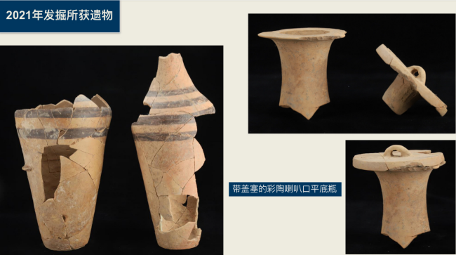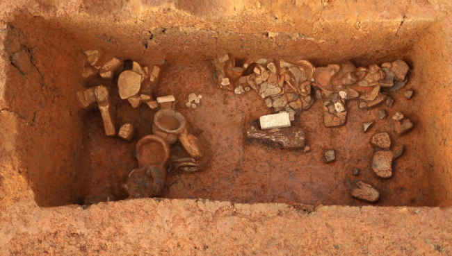 考古調(diào)查初步判斷南佐遺址面積約600萬平方米,年代距今5200年至4600年。遺址核心區(qū)由9座大型夯土臺(tái)圍合,面積約30萬平方米,緊鄰夯土臺(tái)外側(cè)發(fā)現(xiàn)2道環(huán)壕,核心區(qū)東、南、北三面約1000米處還發(fā)現(xiàn)外環(huán)壕遺跡,但目前尚不能確認(rèn)為封閉的環(huán)壕。2021年考古調(diào)查初步了解1號(hào)夯土臺(tái)殘存面積約880平方米、殘高2-3米。核心區(qū)北部發(fā)現(xiàn)大型建筑基址、聯(lián)排房屋等重要遺跡,其中大型建筑F1包括前廳、后堂,僅室內(nèi)面積已達(dá)630平方米,墻壁、地面均為多層白灰面;F2出土白色堆紋陶、白衣陶、白陶、黑陶、朱砂彩繪陶,大型彩陶罐、帶塞蓋喇叭口平底彩陶瓶以及大量水稻遺存,顯示了較高的社會(huì)發(fā)展水平。