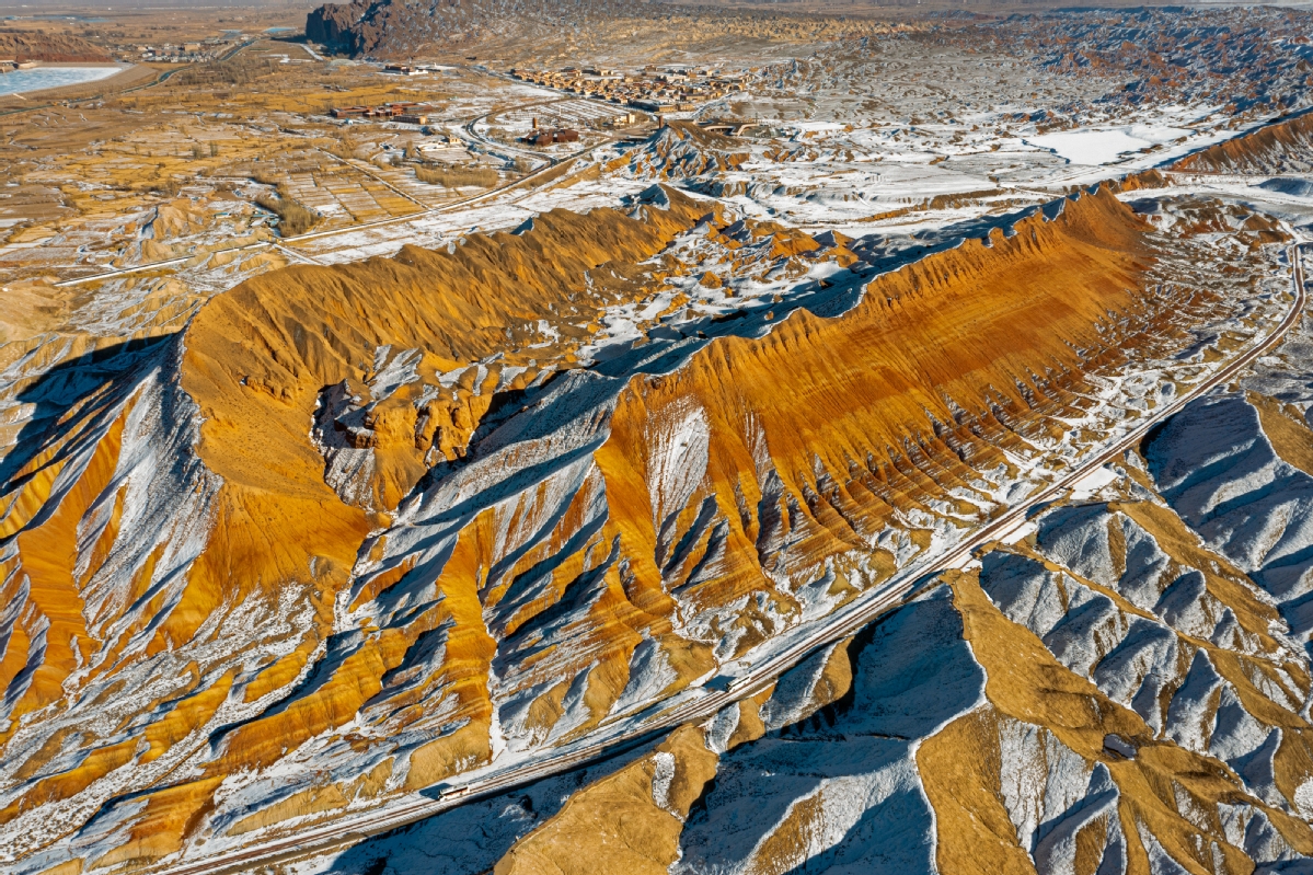 2021年12月12日,甘肅省張掖七彩丹霞在白雪的映襯下,層理交錯(cuò)、色彩斑斕,顯得格外艷麗多彩、美輪美奐。