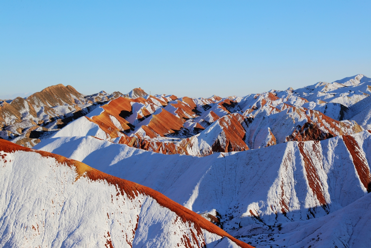 甘肅張掖:雪落七彩丹霞分外艷