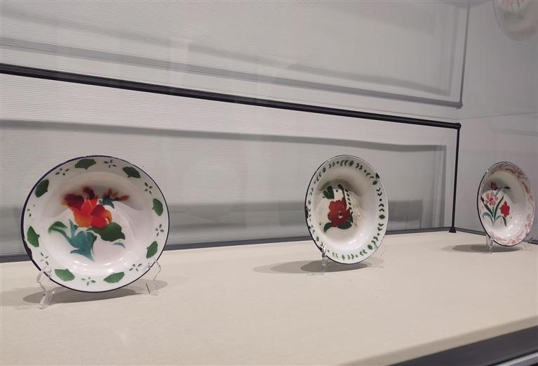 本次展出的156件展品均為蘭州搪瓷廠藝術(shù)底稿和實(shí)物,目前由甘肅三木自行車博物館收藏,其中搪瓷手繪設(shè)計(jì)圖稿65幅,搪瓷器皿91件。展出手繪設(shè)計(jì)圖稿均為蘭州搪瓷廠王村等人設(shè)計(jì)繪圖,分為湯盆、面盆、菜盤、茶盤4大類:圖案內(nèi)容有花鳥(niǎo)、人物、動(dòng)物、客輪、軍艦,包括經(jīng)典圖案“紅雙喜”“幸福”“美好”等,大小尺寸由26至38厘米之間。器皿類搪瓷有盆類、盤類、缸類、碗類。展覽充分體現(xiàn)了蘭州搪瓷廠設(shè)計(jì)室及工人們?cè)诶^承傳統(tǒng)陶瓷工藝的基礎(chǔ)上有了創(chuàng)新和鮮明的時(shí)代特色。