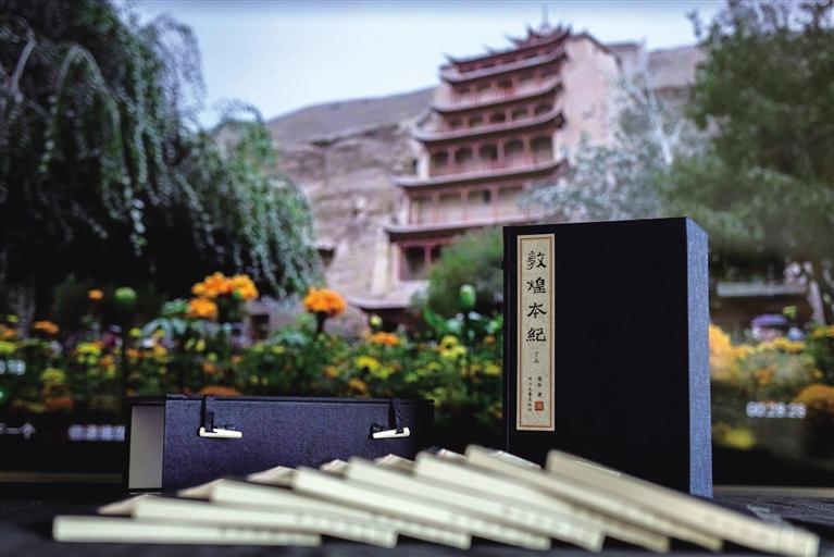 兩個月后,我如愿以償?!抖鼗捅炯o(jì)》繁體線裝本(限量版)出品,兩函,每函八冊,總計(jì)十六冊,繁體豎排,全手工裝訂。技藝之美,工序之繁,裝幀之考究,未之見過!當(dāng)我打開拿到手上時肅然起敬,自然會靜下來,恭恭敬敬翻閱,你能感受到甘肅豐富的歷史文化資源、厚重的文化積淀和波瀾壯闊的滄桑巨變。正是偉大的藝術(shù)和同樣偉大的宗教,在敦煌建筑了人類精神的輝煌莫高窟,人們生活在其中,才擁有現(xiàn)實(shí)人生意義的充實(shí)感和踏實(shí)感。