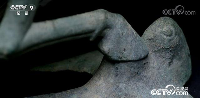 我整器由馬與飛鳥構(gòu)成,一匹正在急速飛奔的駿馬,身高34.5厘米,身長45厘米,全身呈流線型,肌肉健碩有力。馬的三足騰躍在空中,一足踏上飛鳥。飛鳥不知后面追上來的是什么,驚回首的一剎那間,馬已經(jīng)超在了前面,這馬踏飛燕(馬超龍雀)夢(mèng)幻般的瞬間被定格成為永恒。