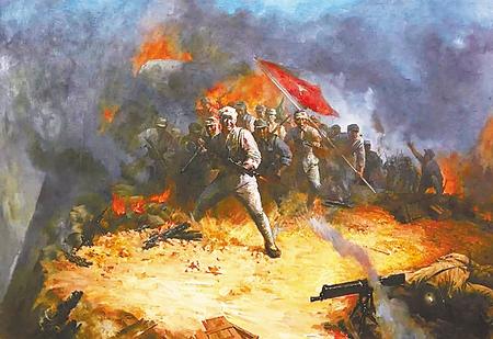 “打!不讓兔崽子抬頭!”年輕果敢的一排長,見沖不上去,便命令機(jī)槍手狠命地射擊。機(jī)槍噴射出的火舌映紅了半個天,槍聲激起的回音像暴雷似的一片轟響,子彈打得敵人陣地上的巖石直冒火星。但是仍壓不倒敵人的火力。敵人的手榴彈不停地在我方突擊道路上爆炸,進(jìn)展十分困難。