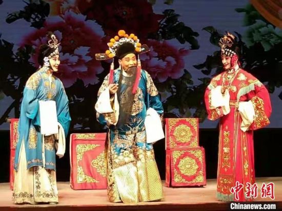 2月中旬,中新網(wǎng)記者采訪甘肅省級非遺傳承人趙希順。圖為趙希順(左二)登臺表演隴劇?!「拭C省隴劇院供圖
