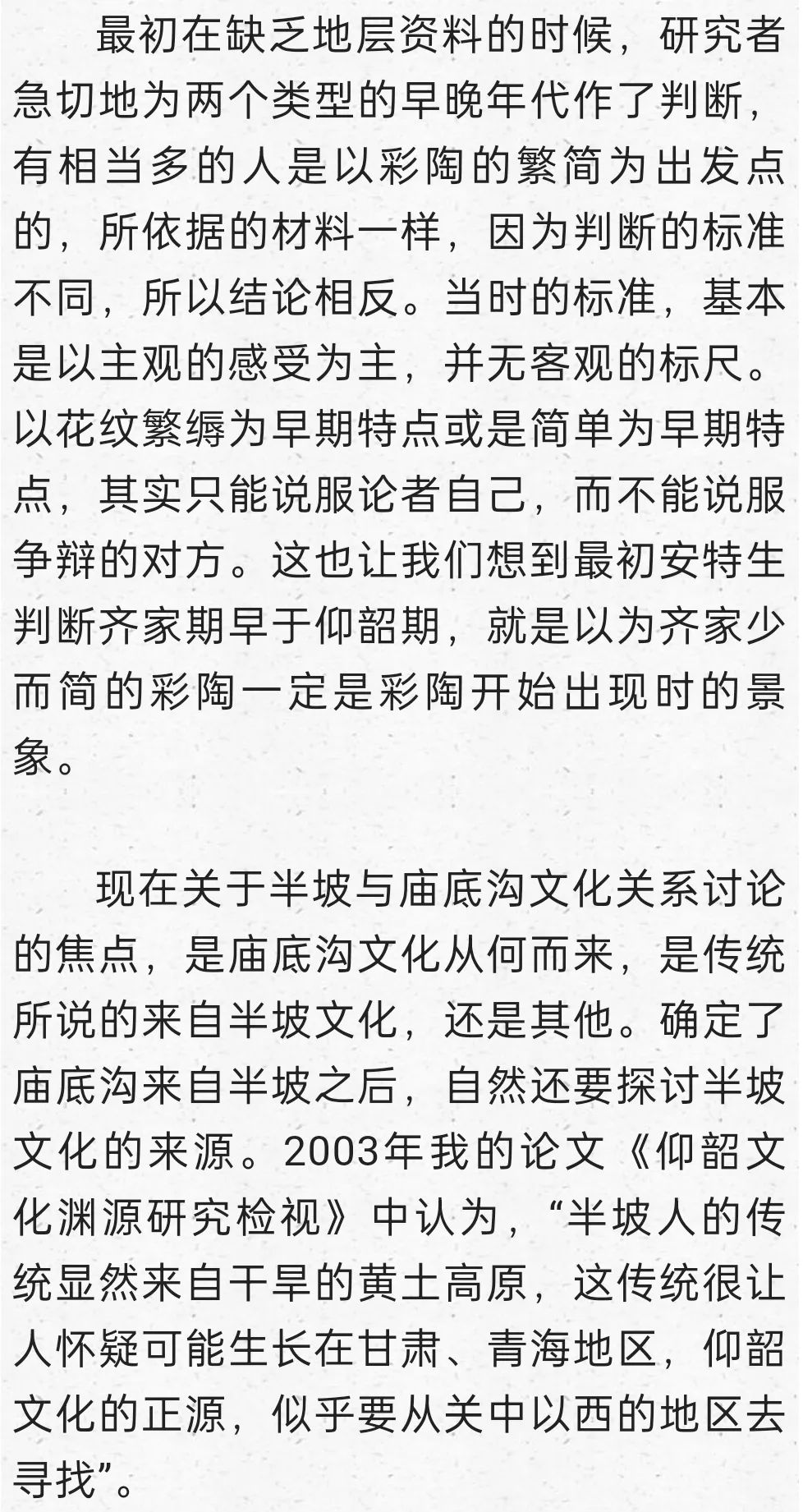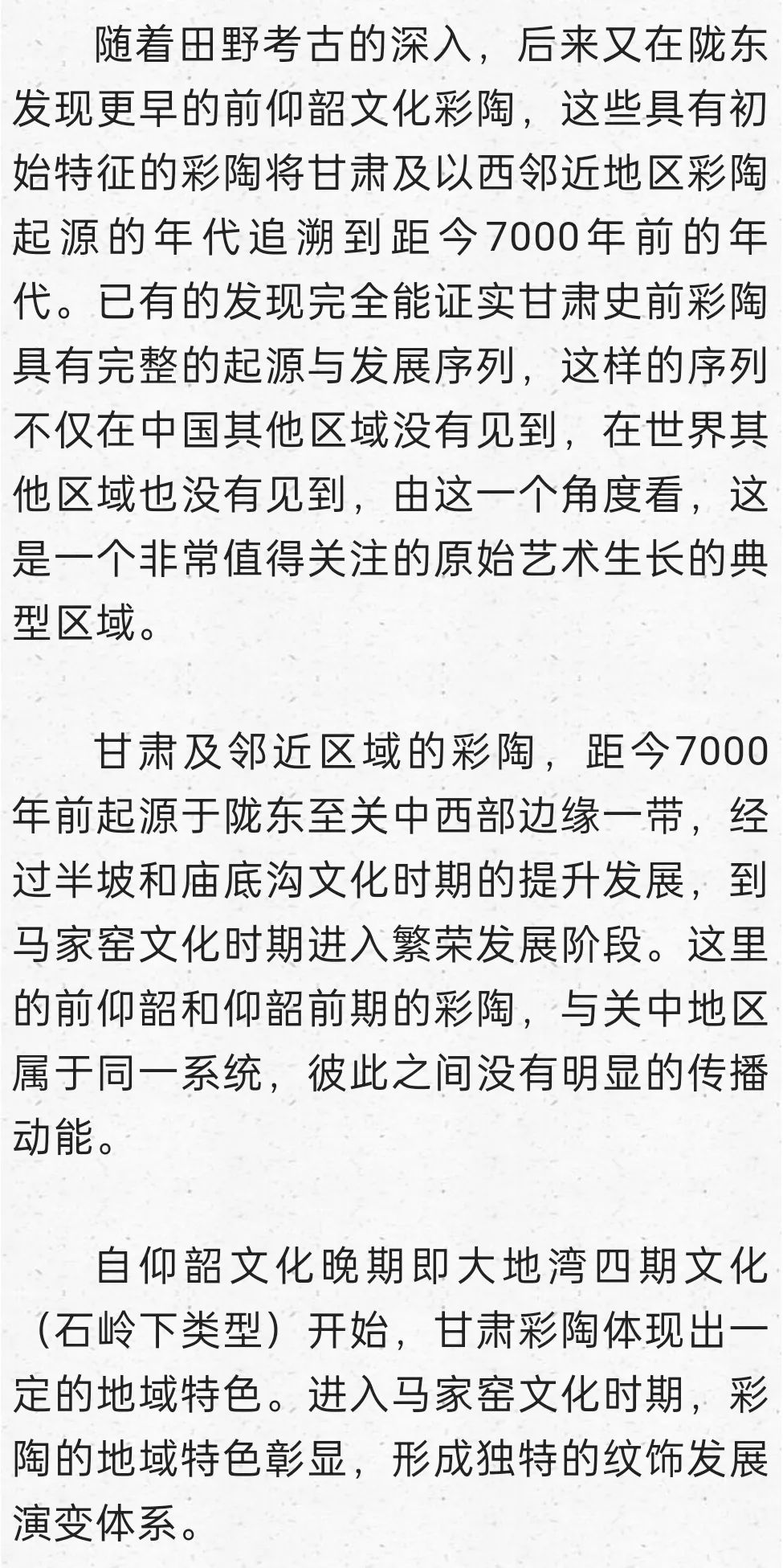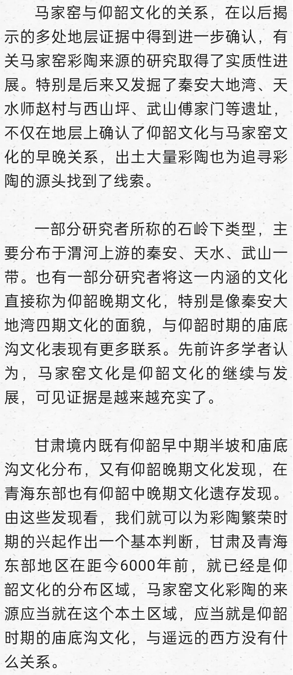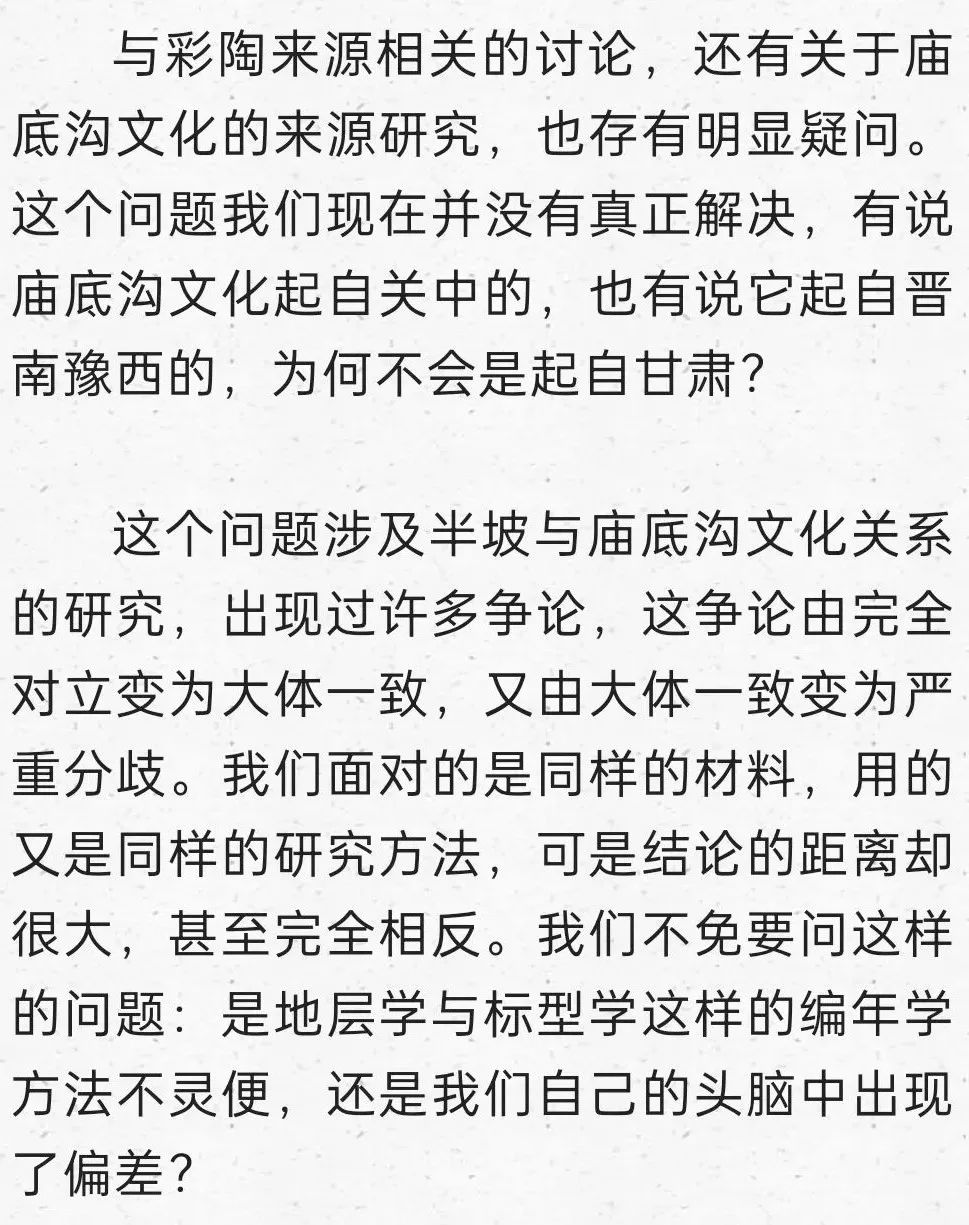 在這里明確提出到甘青尋找仰韶文化的正源,后來我又寫成《秦安大地灣遺址彩陶研究》,討論甘青彩陶的序列,也表達(dá)了類似觀點(diǎn):“甘肅及青海東部地區(qū)在距今6000年前左右,就已經(jīng)是仰韶文化的分布區(qū)域,馬家窯文化彩陶的來源應(yīng)當(dāng)就在這個本土區(qū)域,應(yīng)當(dāng)就是仰韶時期的廟底溝文化。從文化的分布與地層堆積關(guān)系找到了甘肅地區(qū)考古學(xué)文化明確的傳承關(guān)系,由彩陶紋飾演變的考察也能尋找到傳承的脈絡(luò)”。