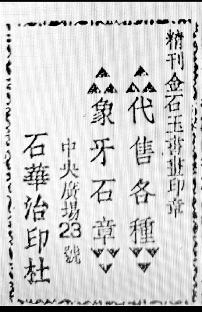 最后要提到的一則廣告也與文化有關(guān)。蘭州和平日報(bào)社1947年出版的《新蘭州》一書中,曾刊登石華治印社廣告,其廣告詞曰:“精刊金石玉書畫印章、代售各種象牙石章”,社址在中央廣場23號(hào),其創(chuàng)辦者即為隴右印壇名宿駱石華先生。駱石華先生1920年生人,彼時(shí)未及而立,尚未入白石先生門下;筆者家外祖解放前供職中央廣場郵局,當(dāng)年曾與石華先生相交。今偶于舊籍中覓得石華治印社當(dāng)年廣告,恭錄于此,既為本文收尾,亦為家外祖與石華先生半個(gè)世紀(jì)友誼之緬懷。