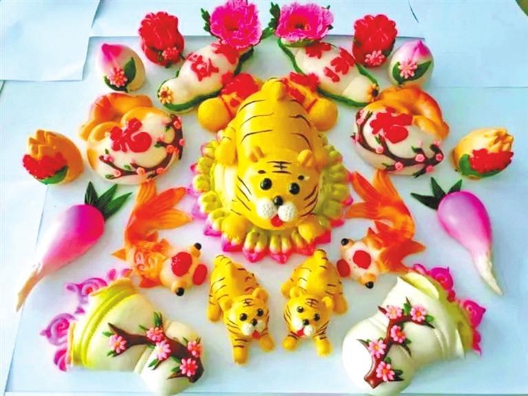 紅艷艷的牡丹花、形象各異的小動(dòng)物……王霞制作的花饃不再是普通的食材,而是栩栩如生的藝術(shù)品。放在展臺(tái)最中間的一個(gè)巨型花饃格外吸睛。這個(gè)花饃用一層層面餅做底座,每一層面餅上都有牡丹、月季、百合等各種花卉競(jìng)相開放,不時(shí)有蝴蝶和小鳥停留在花朵上,充滿著喜意。