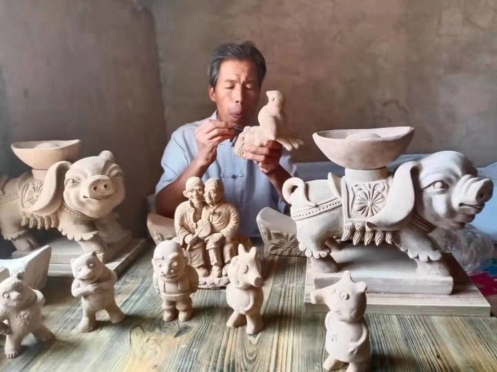 2022年6月,甘肅省平?jīng)鍪蟹俏镔|(zhì)文化遺產(chǎn)項目“泥塑”的第四代傳承人劉泉在雕刻泥塑制品。新華社發(fā)(石軍攝)