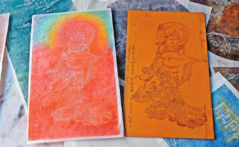 為了突出敦煌色彩,阮琦一改傳拓以墨為色的特點,改用中國畫的顏料,讓一幅幅傳拓畫更能彰顯敦煌壁畫里的色彩之美。