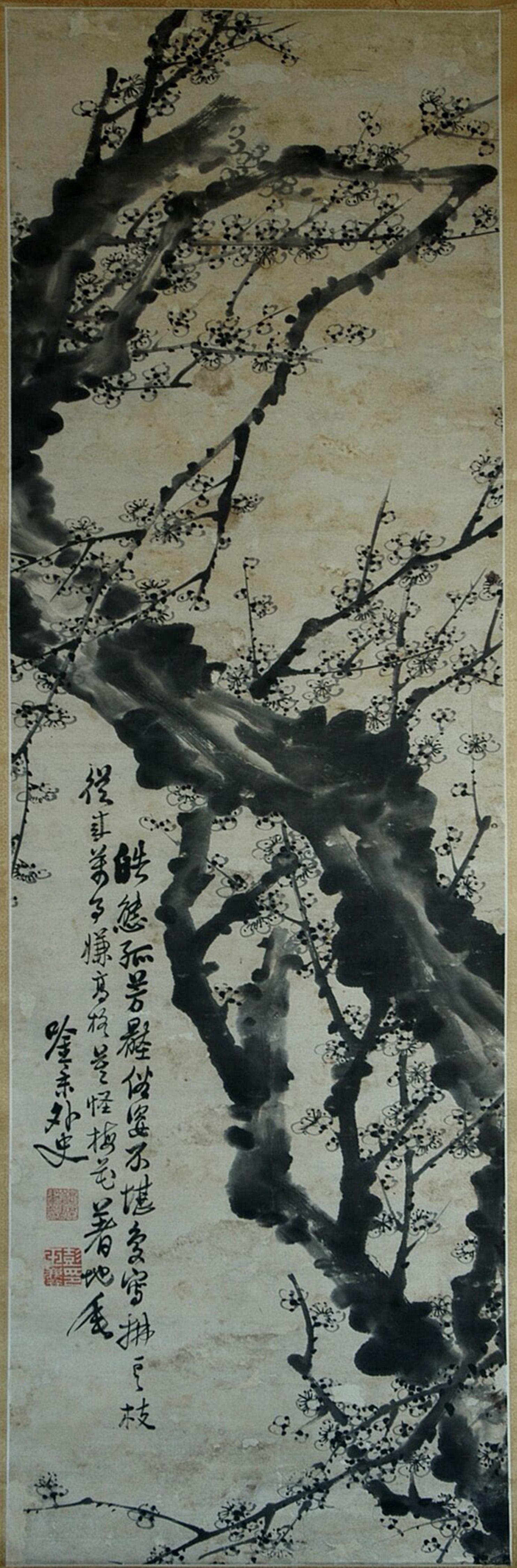 彭玉麟一生所作梅花不下萬幅,清水縣博物館館藏的這幅梅花圖屬館內(nèi)舊藏,其來歷已無從考證。這幅立軸梅花圖長133厘米,寬42厘米。畫面上,一棵下不見根底的老梅,蜿蜒盤旋凌空而上,好似神龍擺尾,顯得古拙蒼勁,點(diǎn)點(diǎn)梅花用寫意筆法一揮而就。畫作不著顏色,老干繁枝,遒勁如鐵,寒梅點(diǎn)點(diǎn),暗香浮動,散發(fā)著濃厚的文人畫氣息。