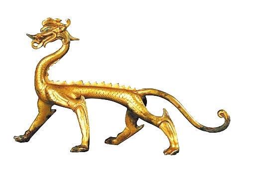 河南偃師的二里頭遺址出土了夏代龍文物,說(shuō)明此時(shí)龍已經(jīng)成為身份、地位的象征。商代開(kāi)始,龍的突出特征便是有了角,并多以夔龍紋等形象出現(xiàn)在青銅器上。春秋戰(zhàn)國(guó)時(shí)代是一個(gè)大變革、大發(fā)展的時(shí)代。與政治上諸侯爭(zhēng)雄、思想界百家爭(zhēng)鳴、陰陽(yáng)學(xué)說(shuō)盛行相適應(yīng),龍的圖案中出現(xiàn)了“群龍”和“交龍”形象。如甘肅省博物館收藏的戰(zhàn)國(guó)盤(pán)龍紋金飾片,兩條龍交叉盤(pán)繞,龍首一側(cè)飾兩條小龍,龍尾一側(cè)飾一對(duì)小虎,作咬噬龍尾狀,龍身上飾聯(lián)珠紋。隨著華夏大地結(jié)束戰(zhàn)亂,走向一統(tǒng),秦漢時(shí)代的龍出現(xiàn)相對(duì)規(guī)范和定型的趨勢(shì),并出現(xiàn)了背上長(zhǎng)翅膀的龍。魏晉南北朝時(shí)期龍形象對(duì)內(nèi)融合各少數(shù)民族文化,對(duì)外融合佛教文化,流行的龍紋頭部扁長(zhǎng),角似鹿角,發(fā)鬣后披,挺胸奮肢,呈現(xiàn)出矯健奔放、線條流暢、氣韻生動(dòng)的特點(diǎn)。