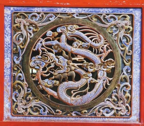天水伏羲廟位于天水市秦州區(qū)西關(guān)伏羲路,是目前我國規(guī)模最宏大、保存最完整的紀(jì)念伏羲氏的明代建筑群,1963年被列為甘肅省重點文物保護單位。伏羲廟中有一對龍鳳檻窗木雕,是明代木雕中天水雕刻技法傳世至今的佳作,約有500年歷史。當(dāng)時匠人將多塊油松木板拼接成方形,再以透雕技法在框內(nèi)圈雕圓形,中刻龜背舞鳳,外飾祥云蝙蝠,龍鳳雀躍,惟妙惟肖,最后用礦物顏料上色點睛。龍鳳檻窗木雕將藝術(shù)性和功能性完美統(tǒng)一,承載了諸多文化寓意。有學(xué)者認(rèn)為,這組木雕的圖案既歌頌了伏羲開創(chuàng)中華文明的豐功偉績,又體現(xiàn)了對古文化的一脈傳承。