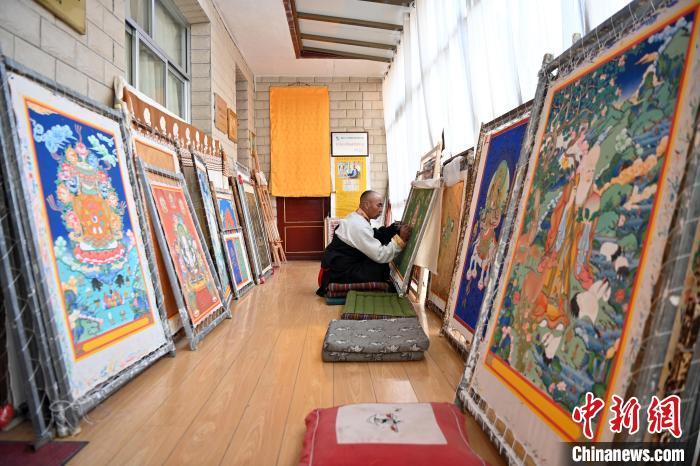 圖為交巴加布展示以拉卜楞寺為主題的唐卡作品。交巴加布不僅繼承了傳統(tǒng)唐卡技藝,更在創(chuàng)新中展現(xiàn)了個人特色。他結(jié)合現(xiàn)代審美和繪畫技巧,使作品既保留了傳統(tǒng)的韻味,又具有鮮明的現(xiàn)代氣息。這種獨特的藝術(shù)風(fēng)格使他的作品在眾多唐卡中脫穎而出,成為藏族民眾和藝術(shù)愛好者爭相收藏的藝術(shù)珍品。九美旦增 攝