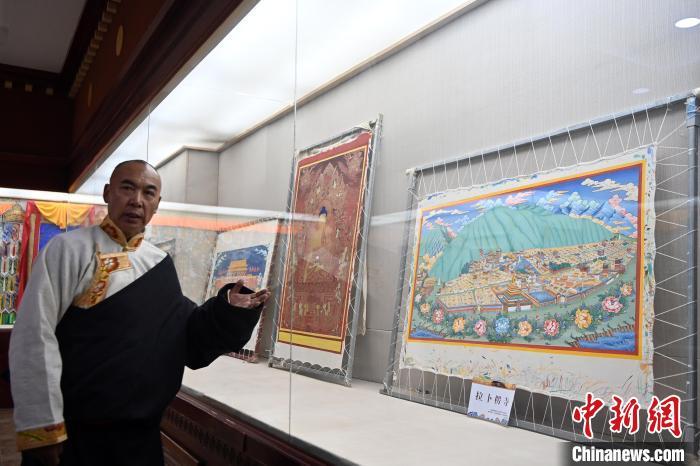 圖為精品唐卡展廳內(nèi)展出的交巴加布與父親的唐卡作品,常吸引游人“打卡”。九美旦增 攝