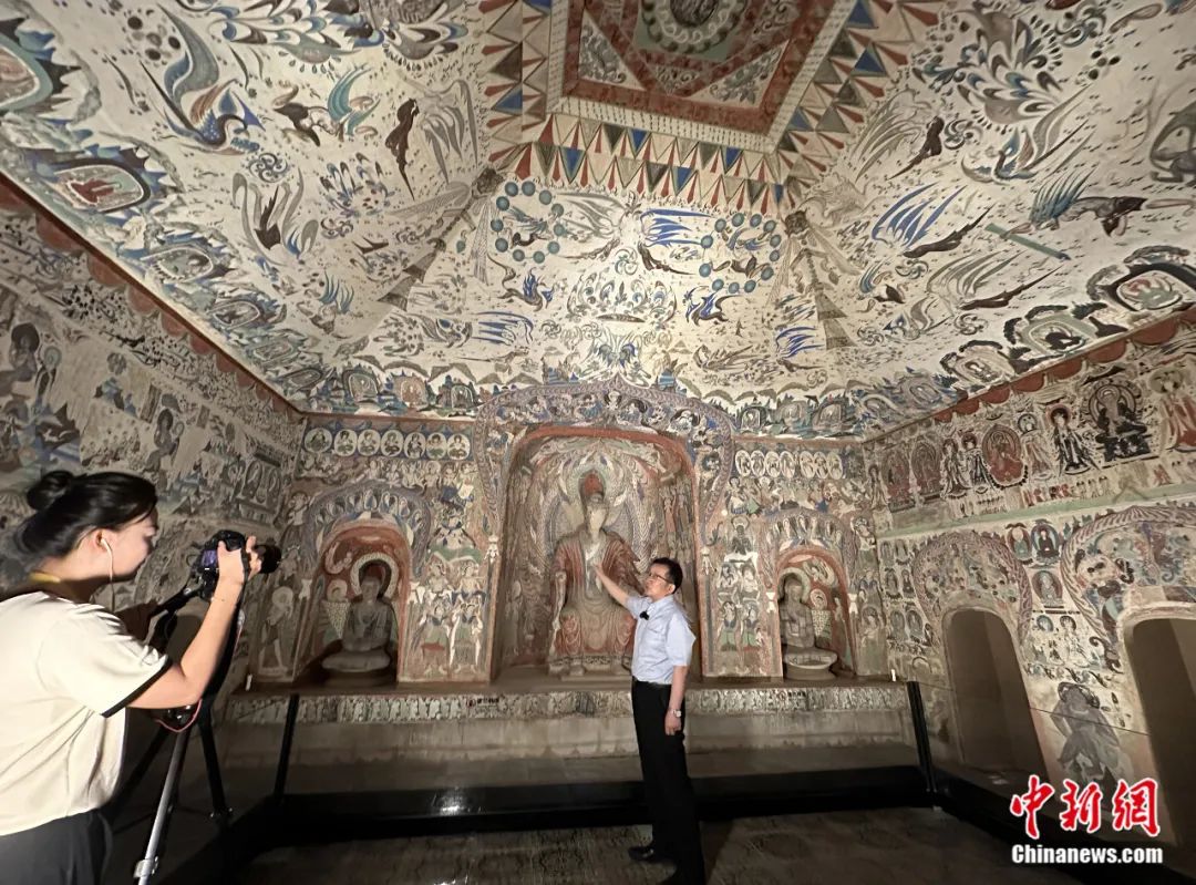 2023年7月,敦煌研究院副院長(zhǎng)張?jiān)衷诙鼗湍呖叩?85窟原大復(fù)制窟內(nèi),接受中新社“東西問”獨(dú)家專訪。丁思 攝