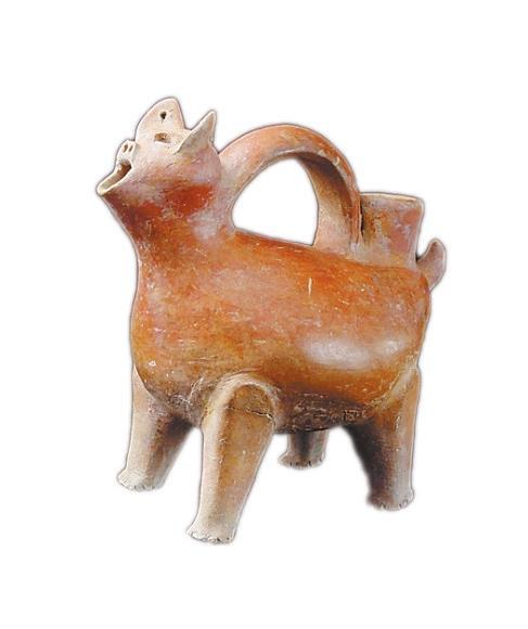 紅陶獸形壺,高21.6厘米,夾砂紅陶,通體磨光,遍施紅色陶衣,光潤亮澤。器型圓面聳耳,拱鼻,張口,耳穿小孔,四肢粗壯,短尾上翹,背裝弧形提手,尾根部一筒形注水口,嘴可往外倒水,腹部鼓起加大了容積,四足立起可供加熱,使用方便,造型生動美觀,集實用與仿生藝術(shù)于一身,是大汶口文化獨有的器形,充滿了創(chuàng)造性的靈感,是新石器時代一件難得的陶器珍品。