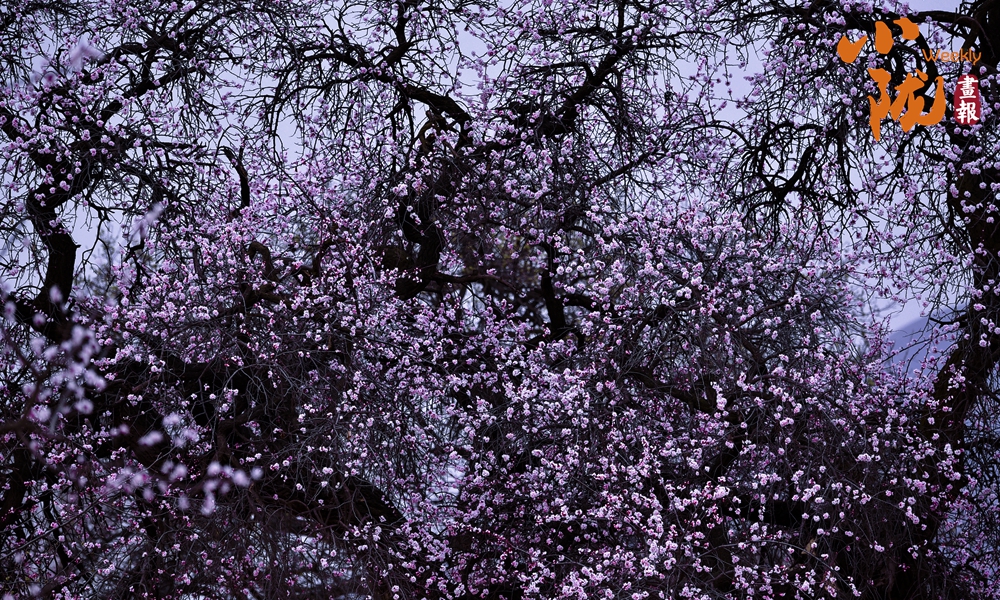 大面積杏樹應季綻放,將一片片大地披上春天的“盛裝”,紫色的杏花,為大地寫滿了詩行,編織出一幅美麗的鄉(xiāng)村畫卷。