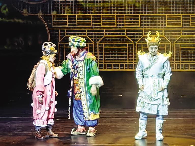演出現(xiàn)場,大美敦煌被搬到舞臺(tái)上,星云變幻間,時(shí)空在劇場轉(zhuǎn)換,鹿鳴、莉娜、巴巴亞穿梭在沙漠、月牙泉和莫高窟、敦煌市集之間,與“先知”對話,向神仙請教,與沙塵暴斗爭,根據(jù)蛛絲馬跡尋找3件天宮樂器的下落。