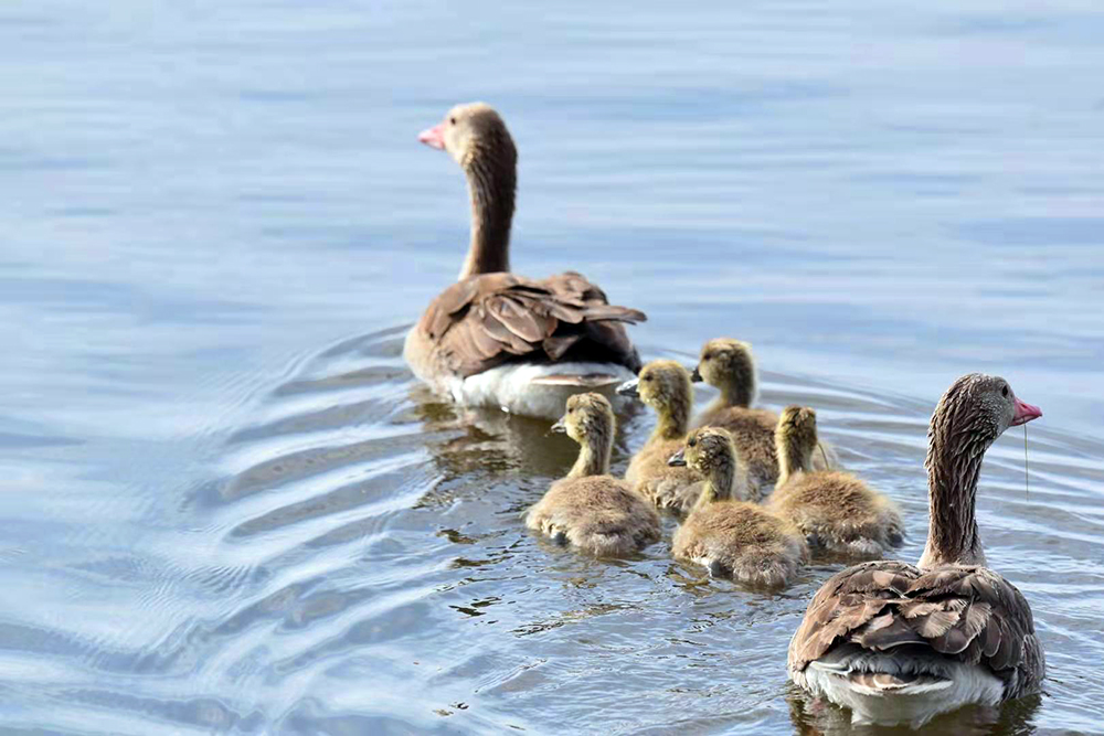 灰雁是鴨科雁屬鳥(niǎo)類,屬國(guó)家重點(diǎn)保護(hù)的“三有”鳥(niǎo)類,也是陽(yáng)關(guān)濕地的夏候鳥(niǎo)。監(jiān)測(cè)顯示,在陽(yáng)關(guān)濕地繁殖的灰雁家族有100多只。每年3月下旬遷飛至陽(yáng)關(guān)濕地,4月中旬筑巢繁殖,5月上旬孵化出雛鳥(niǎo)4至5只?;已銥?ldquo;一夫一妻”制,孵化由雌鳥(niǎo)單獨(dú)承擔(dān),雄鳥(niǎo)在巢附近負(fù)責(zé)警戒。待雛鳥(niǎo)破殼出窩后,則由雌雄共同撫育。灰雁生性膽小、機(jī)警,小寶寶溜達(dá)時(shí),雌鳥(niǎo)在前開(kāi)道,雄鳥(niǎo)負(fù)責(zé)斷后,小寶寶上岸覓食嫩草芽時(shí),雄鳥(niǎo)仍然負(fù)責(zé)警戒,若有危險(xiǎn)立刻鳴叫警示。故而,近距離拍攝灰雁雛鳥(niǎo)是比較困難的。