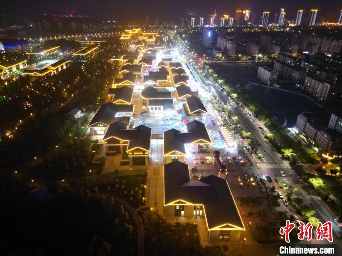 5月中旬,當(dāng)夜幕降臨、華燈綻放,甘肅武威市涼州區(qū)“星光夜市”彩燈點(diǎn)亮夜空。(無(wú)人機(jī)照片) 戴文昌 攝