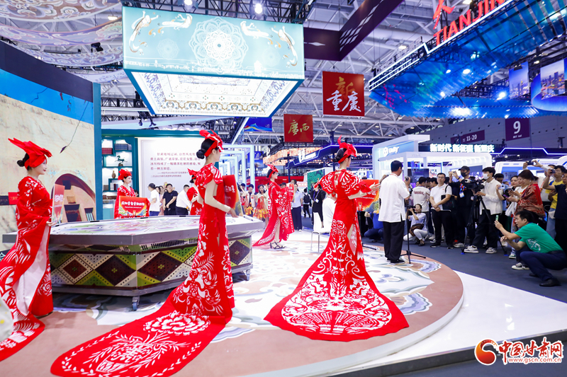 憑借一把剪刀一張紅紙,慶陽人民心隨意到,手隨心動,創(chuàng)造出了一件件巧奪天工的剪紙藝術。在甘肅主題館慶陽非遺文化展示區(qū)內(nèi),民俗藝人以活態(tài)非遺的生動形式,帶領參觀者體驗慶陽非遺文化魅力。