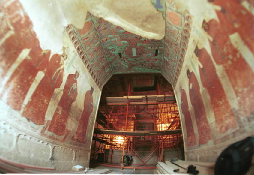 1989年年初,中國敦煌莫高窟465號窟內(nèi)的五處元代壁畫被盜。破案后,敦煌研究院立即組織有關(guān)專家將這些支離破碎的壁畫拼接粘合,以高超的技藝復原,然后按照圖片檔案資料進行描繪,使它們基本上恢復了被盜之前的本來面貌。