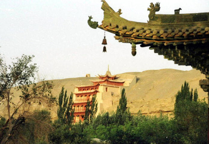從20世紀70年代末開始,大量先進科技不斷被引入敦煌石窟保護。新技術(shù)、新材料、新手段的不斷運用,豐富了敦煌遺產(chǎn)的保護技術(shù)和保護手段,有效改變了石窟內(nèi)部及其環(huán)境的保護狀況,使敦煌遺產(chǎn)的保護工作從原來的搶救性保護,過渡到了科學保護階段。圖為透過敦煌莫高窟前的牌樓一角望去,敦煌莫高窟標志性建筑九層樓依舊雄偉壯觀。新華社記者梁強攝(2004年10月25日發(fā))