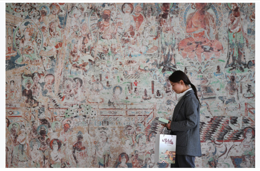圖為敦煌研究院文物數(shù)字化保護團隊創(chuàng)意營銷人員廖雪婷從一幅高保真復制壁畫前走過(2023年4月25日攝)。新華社記者陳斌攝