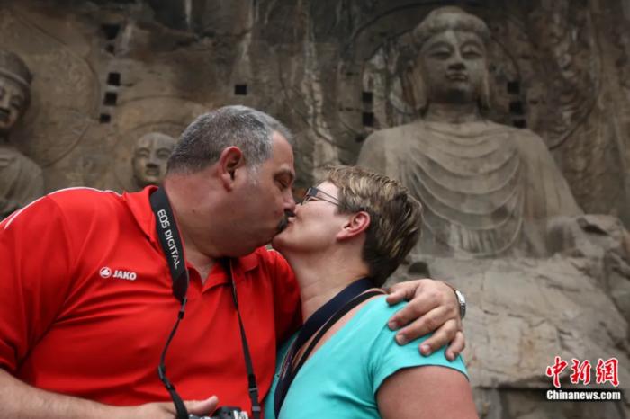 兩名外國游客在河南洛陽龍門石窟盧舍那大佛前拍照留念。徐崇德 攝