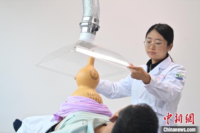 7月16日,甘肅省平?jīng)鍪徐`臺縣皇甫謐針灸康養(yǎng)館內(nèi),工作人員對患者進行葫蘆灸治療。2006年,靈臺皇甫謐針灸術(shù)入選第一批甘肅省非物質(zhì)文化遺產(chǎn)名錄。靈臺作為皇甫謐故里,當(dāng)?shù)孛癖姺浅UJ(rèn)可中醫(yī)康養(yǎng),針灸、拔火罐、推拿、葫蘆灸、火龍灸(督脈灸)等中醫(yī)特色療法受到了很多人的青睞,當(dāng)?shù)毓俜揭餐ㄟ^舉辦大型節(jié)會等助推中醫(yī)康養(yǎng)產(chǎn)業(yè)發(fā)展。 皇甫謐是針灸醫(yī)學(xué)鼻祖,其《針灸甲乙經(jīng)》已在多個國家被廣泛傳播應(yīng)用。中新社記者 李亞龍 攝