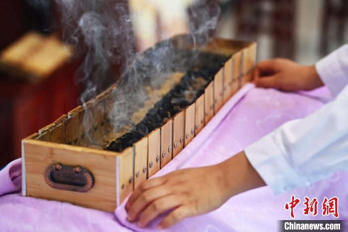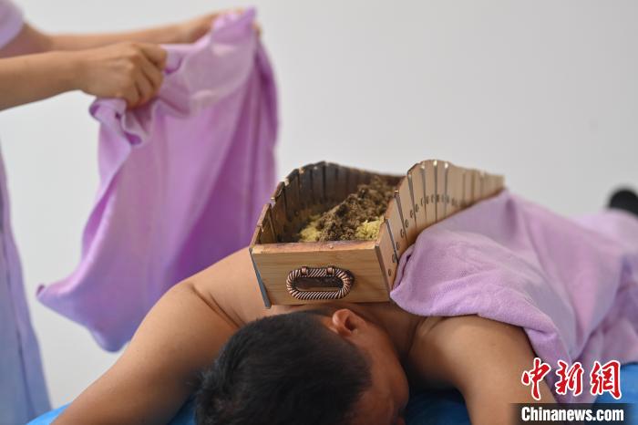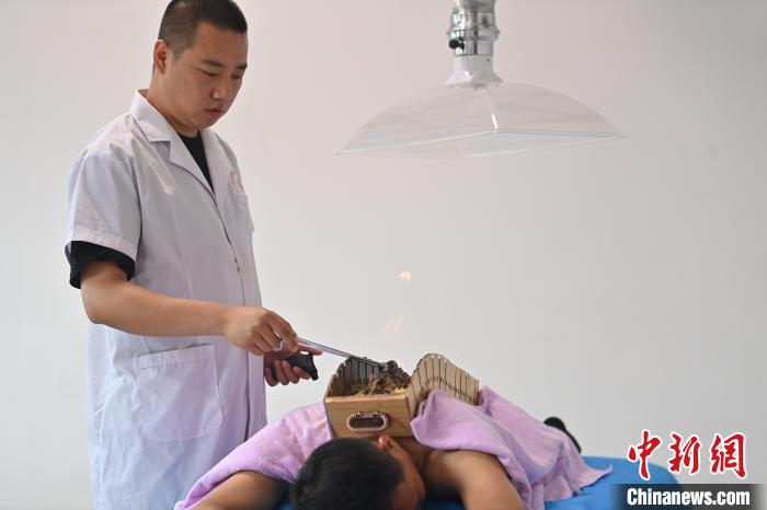 7月16日,甘肅省平?jīng)鍪徐`臺縣皇甫謐針灸康養(yǎng)館內(nèi),工作人員對患者進行火龍灸治療。2006年,靈臺皇甫謐針灸術(shù)入選第一批甘肅省非物質(zhì)文化遺產(chǎn)名錄。靈臺作為皇甫謐故里,當(dāng)?shù)孛癖姺浅UJ(rèn)可中醫(yī)康養(yǎng),針灸、拔火罐、推拿、葫蘆灸、火龍灸(督脈灸)等中醫(yī)特色療法受到了很多人的青睞,當(dāng)?shù)毓俜揭餐ㄟ^舉辦大型節(jié)會等助推中醫(yī)康養(yǎng)產(chǎn)業(yè)發(fā)展。 皇甫謐是針灸醫(yī)學(xué)鼻祖,其《針灸甲乙經(jīng)》已在多個國家被廣泛傳播應(yīng)用。中新社記者 李亞龍 攝