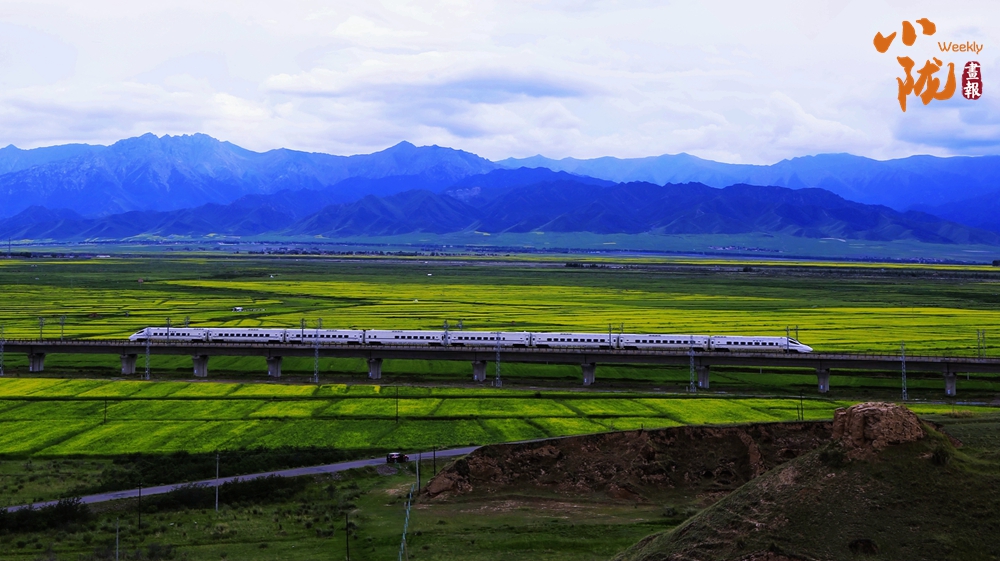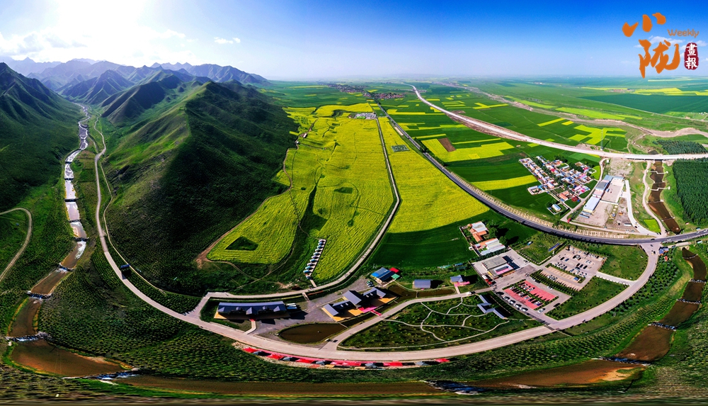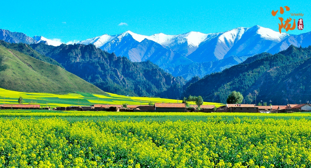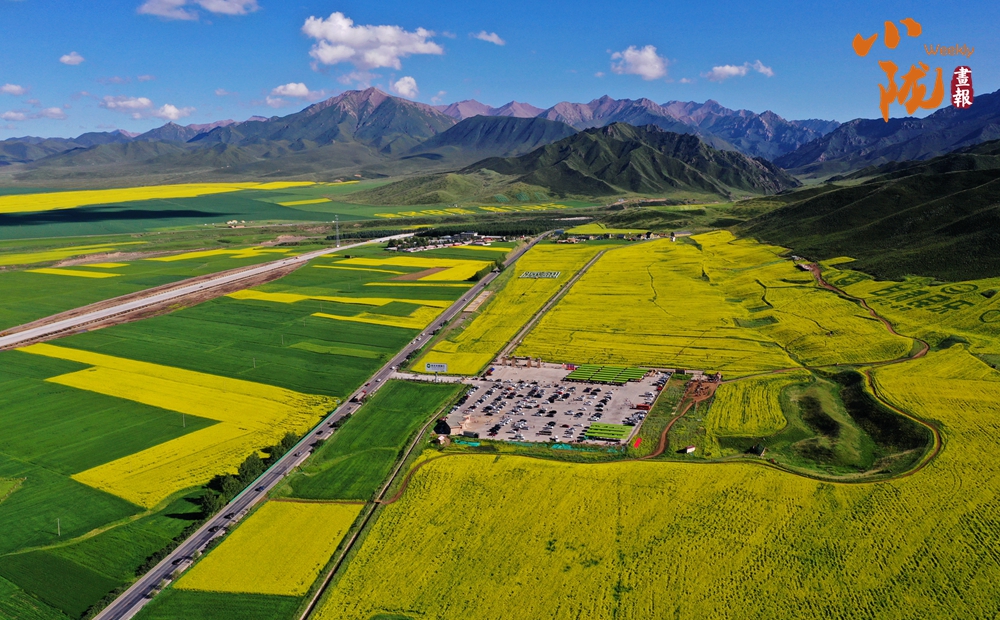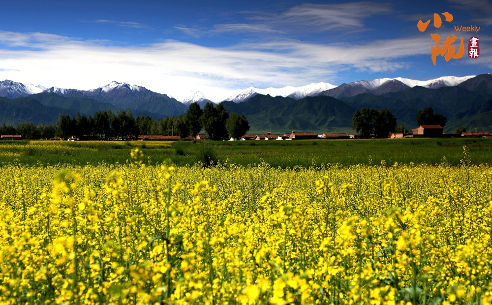 在藍(lán)天白云和祁連雪峰的映襯下,那盛開的油菜花、點綴在花海中的村莊人家,勾勒出一幅優(yōu)美的田園風(fēng)光畫卷。