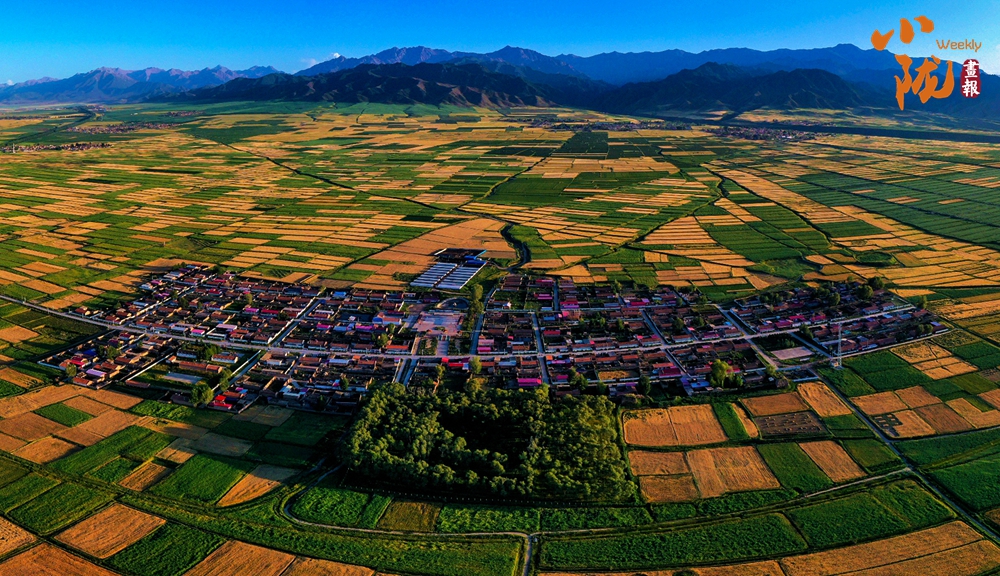 廣袤無邊的田野生機盎然,金黃色的油菜花夾雜著一塊塊碧綠色的麥田,好像給大地鋪上了一層五顏六色的大地毯。漂亮的民居鑲嵌其中,與祁連山相互輝映,在陽光下美麗極了!