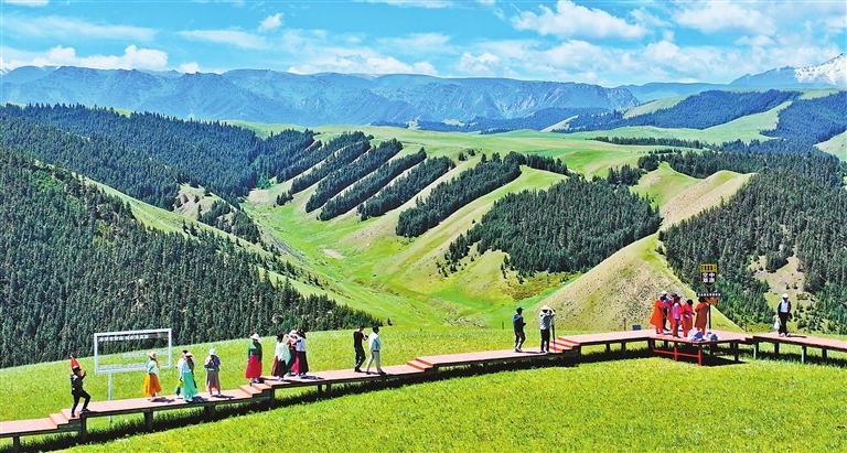 藍(lán)天白云下,裝有護(hù)欄的木棧道在山間蜿蜒盤旋,外地游客站在棧道上,正在饒有興趣地伸手投喂溫順的馬鹿。