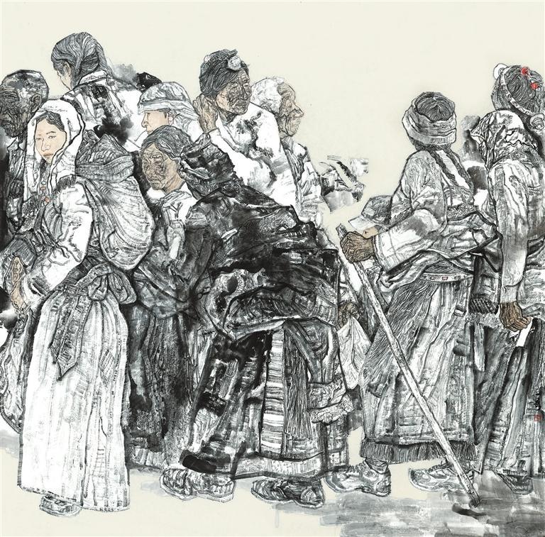 作品《趕集》主要描繪了不同年齡階段的人物聚集一起趕集的一幕,以筆墨求真的態(tài)度,通過不同的形象去表現(xiàn)人物的真善美。在落墨前,我對人物造型和畫面形式結(jié)構(gòu)反復(fù)推敲打磨,力求作品更有溫度和厚度。
