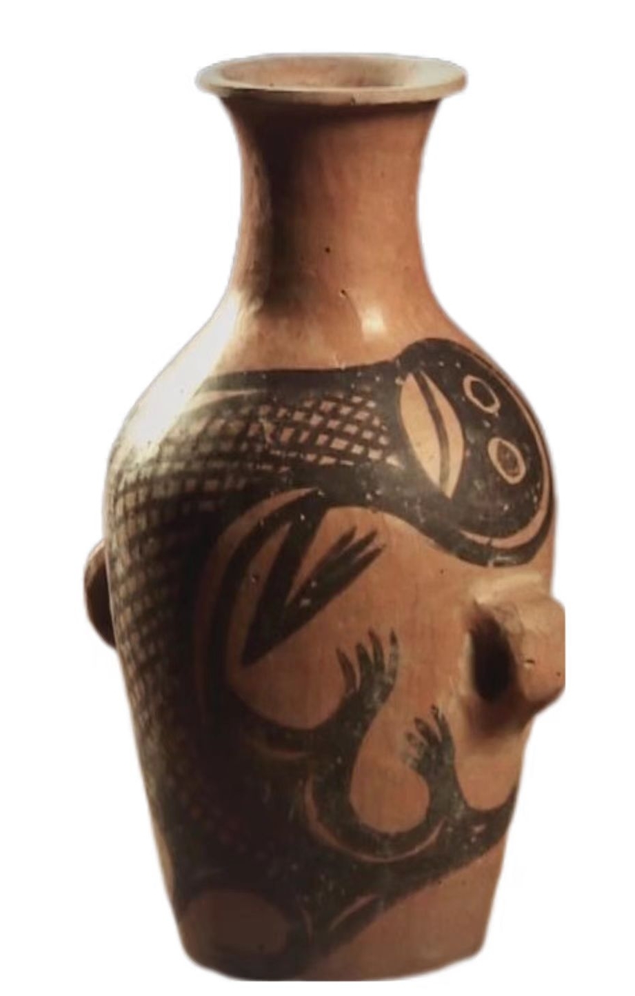 這件鯢魚紋彩陶瓶為泥質(zhì)紅陶,高18.5厘米,口徑寬5.7厘米,底徑7厘米,腹徑14厘米,重430克。陶瓶最顯著的特征是在腹部繪有動物圖紋。動物的身子呈蜷曲狀,尾巴向上翹舉,交于頭上。臉似人面,雙眼圓睜而有神。嘴巴寬闊,顎下有須,頭頂兩側(cè)有伸出的節(jié)肢狀腮。奇怪的是,它只有一對前肢,肢端有張開的四肢。陶瓶身上繪制有網(wǎng)格狀的線紋。線條流利而生動,變化豐富,展現(xiàn)出了熟練自如的繪畫技巧。從鯢魚圖案的繪制來看,紋飾用筆鋒畫作的線條遒勁有力,頓挫有致。粗細不同的線條之間,還凸顯出了圖紋部位的主次。彩陶的出現(xiàn),也似乎在見證著先祖?zhèn)冊谑庝离x居、不常厥邑的歲月中所經(jīng)歷的那些艱難生活。