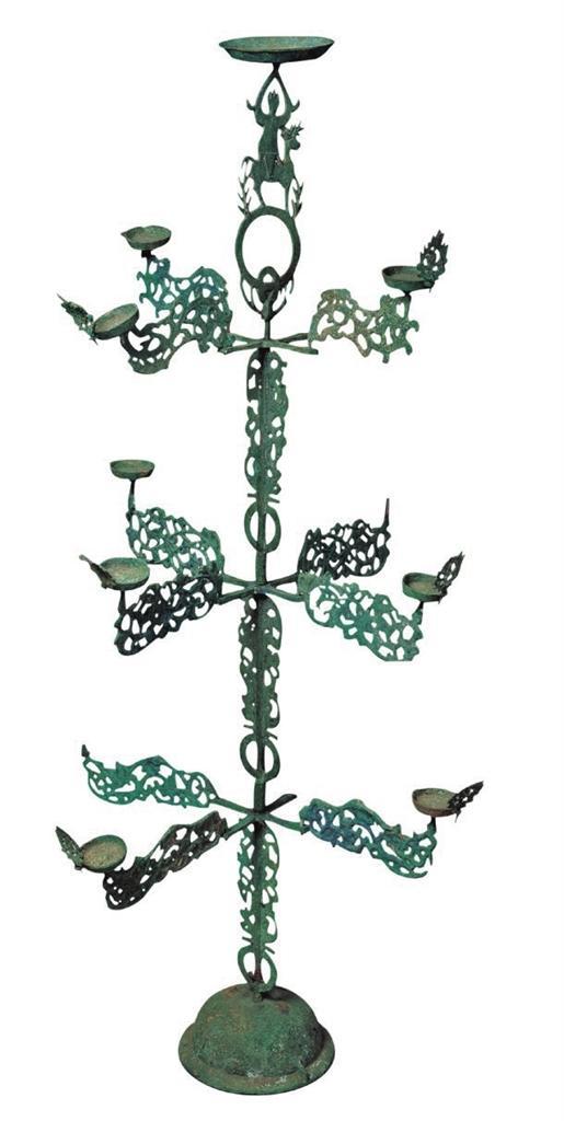 ▲1969年出土于武威市雷臺漢墓。燈呈樹形,由燈盞、葉、干枝和座等部分組成。燈座為覆缽狀,飾瑞獸紋和云氣紋。燈的主干為三段套插而成,每段均飾有連環(huán)和鏤空葉片,段與段銜接處各有一個十字形托架。十字托橫向四出,四端各飾透雕花葉一個, 每層花葉紋飾各不相同,葉端承托小燈盞一只,燈盞外沿各有桃形葉飾一個,象征火焰。主干頂端為鏤雕仙人騎鹿形花飾,仙人雙臂高舉托一大燈盞。原有燈13盞,現(xiàn)存9盞。