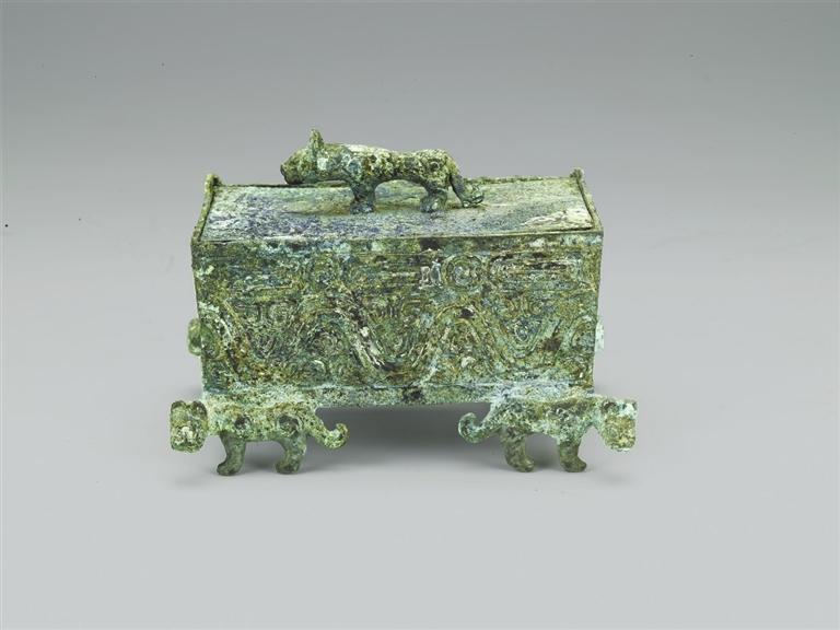 1993年山西省曲沃縣北趙村晉侯墓地62號(hào)墓出土。波曲紋虎足方盒為生活用具,出土于晉穆侯夫人墓。盒為長(zhǎng)方形,口徑略大于底徑,斜直壁,頂部有立體的虎形捉手,兩扇小蓋可以開啟,盒下有四虎為四足,虎首朝外。盒四壁上部飾鱗紋,下部飾波曲紋。此盒設(shè)計(jì)精巧,器型較小,紋飾精美,應(yīng)是古代貴族女性用來(lái)珍藏小型物件的容器。