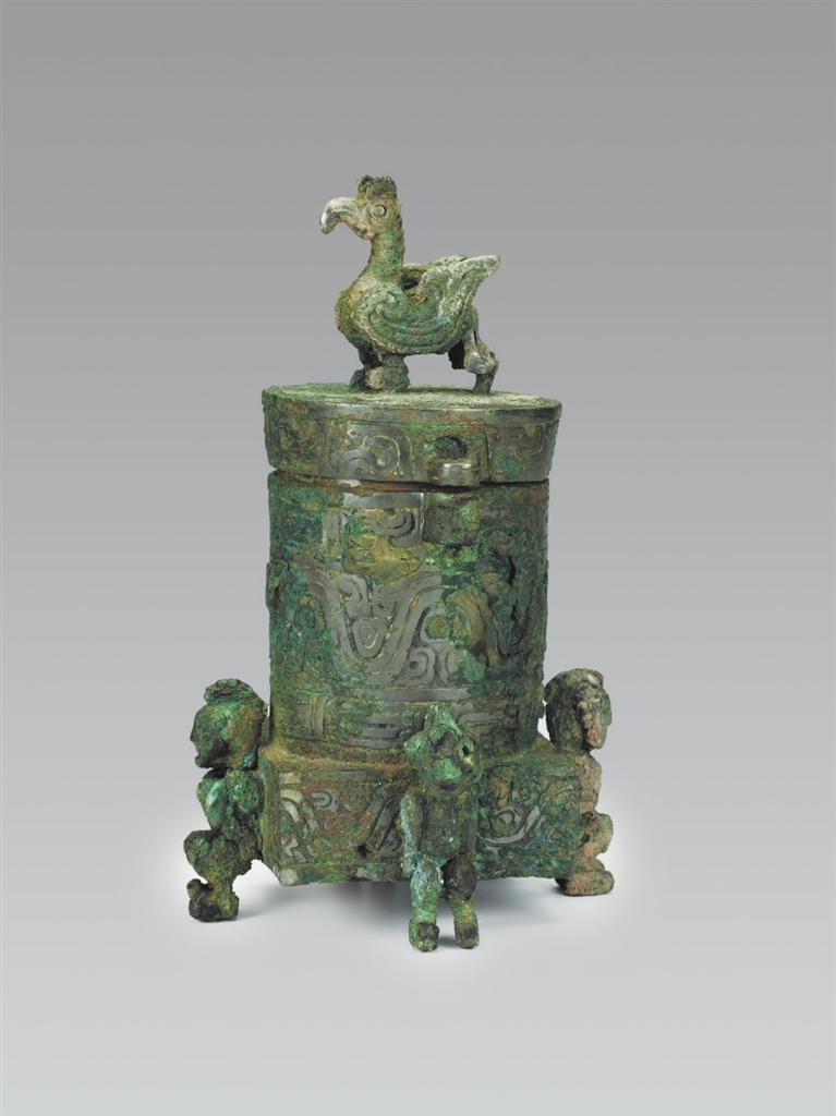 山西省曲沃縣北趙村晉侯墓地63號(hào)墓出土。圓筒形,帶蓋,蓋與器體以子母口套合,蓋平頂,上有圓雕立鳥形鈕,鳥彎喙,雙目圓睜,作展翅欲飛狀。器為平口,口沿有一對(duì)貫耳,直壁,方形底座,底座四壁各有一個(gè)人形足以承器體。人發(fā)髻高聳,赤身裸體,屈膝下蹲,作奮力抬舉器物狀,形象寫實(shí)生動(dòng)。方座飾波曲紋,內(nèi)底有兩只小鈴,可發(fā)聲。蓋頂飾斜角云紋一周。蓋沿和口沿飾變形獸體紋,筒腹和方座飾波曲紋,筒下層飾鱗紋一周。這種形制的青銅器尚屬首見,其功用還有待于深入研究,但它獨(dú)特的藝術(shù)造型和裝飾卻可以說(shuō)是集眾器之長(zhǎng),獨(dú)步天下。