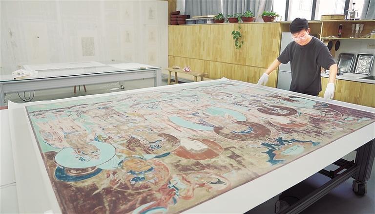 將畫(huà)作噴濕、刷上糨糊、覆上紙、刷平、上墻全色……7年里,徐喆在周而復(fù)始的工序里與作者對(duì)話,在時(shí)間的長(zhǎng)河里,感受歷史的厚重和精彩。