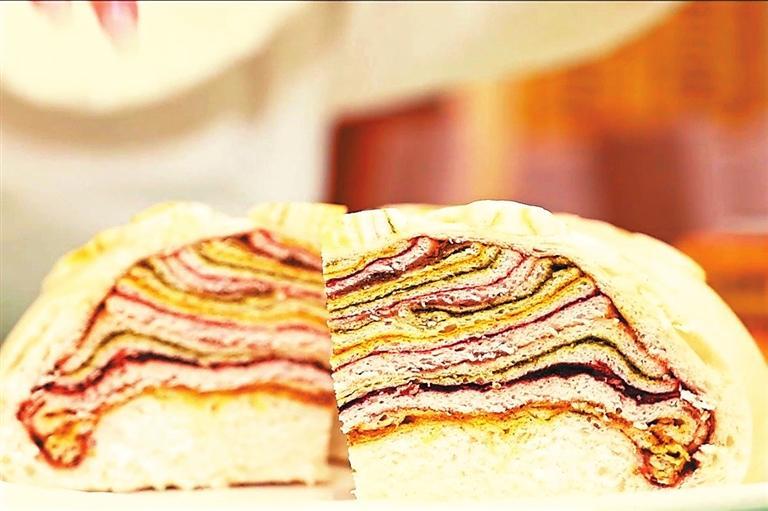 母親最拿手的還是做千層大月餅,做法與平常做饃有點不一樣,發(fā)好面后取適量揉好,切成同樣大小的若干份并搟壓成長方形的薄面皮。一層薄皮一層餡,餡料與烙的糖饃有的不一樣,重在色澤,每層分別抹上姜黃、紅曲、苦豆(香豆)粉、芝麻、菜籽油、糖玫瑰、葡萄干,黃、紅、黑、綠相間,一層黃一層綠一層紅一層黑,一層白糖一層紅糖一層玫瑰糖,一層一層摞好,做成一個六七層的圓餅。最后用薄皮蓋住一摞摞面皮,餅邊捏緊捏好后壓花塑形,表面用模型壓花,用專用做飯梳子一行行點上,或一行白鷺上青天,面皮如一塊畫布,精雕細琢,怎么好看怎么做,做得隨心所欲又精心設計。還會刷姜黃與菜籽油拌好的油料,撒上芝麻粒和葡萄干,一個千層餅就基本成型了。