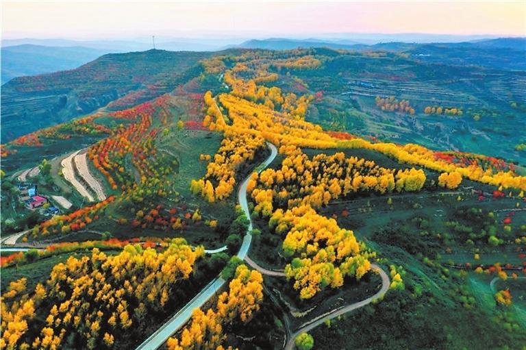 金秋時節(jié),這里秋葉五彩繽紛,黃得如金,綠得如玉,紅得如火,把秋姑娘打扮得格外妖嬈。一陣涼風拂過,金黃的樹葉,搖曳著一把把小扇子,從空中飄飄而下,似乎在訴說著一個美麗的童話。村落散落在綿延數(shù)里的山腳下,村前屋后金色圍繞,梯田如鏈似帶、穿插交錯,如一幅幅線條簡潔明快的木刻版畫。