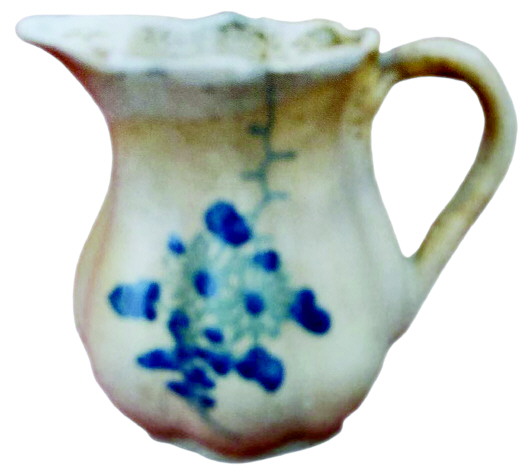 該口杯高10cm,上口手捏黏泥接連,珍珠釉澆注粘連處留有數(shù)滴珍珠釉淚珠??谘厍皟A,連口粘痕明顯裸露。通體呈吊南瓜分棱,八道指泥壕顯八股棱條。造型珍瓏靈秀,珍貴之處在于上施淺瑪瑙釉,體面使用藍(lán)寶石礦料畫一束盛開的菊花。畫筆嫻熟簡練,富有立體感,且活靈活現(xiàn)。在背面腰中部,用淡青花題“□□”二字,字雖模糊不清,但胎土細(xì)膩,瓷壁輕薄又堅硬如骨,胎底色黃中泛紅,瓷體表面青釉中又泛小針褐色點。把手處,窯變?yōu)轵球咀吣嗉y。這種泥紋,沉重古樸,明亮而深沉,是釉層在干燥或燒成時發(fā)生干裂,后在高溫階段又有釉流入填補(bǔ)而形成的。在民國以前,蚯蚓紋曾被作為判斷鈞釉的唯一標(biāo)準(zhǔn)。
