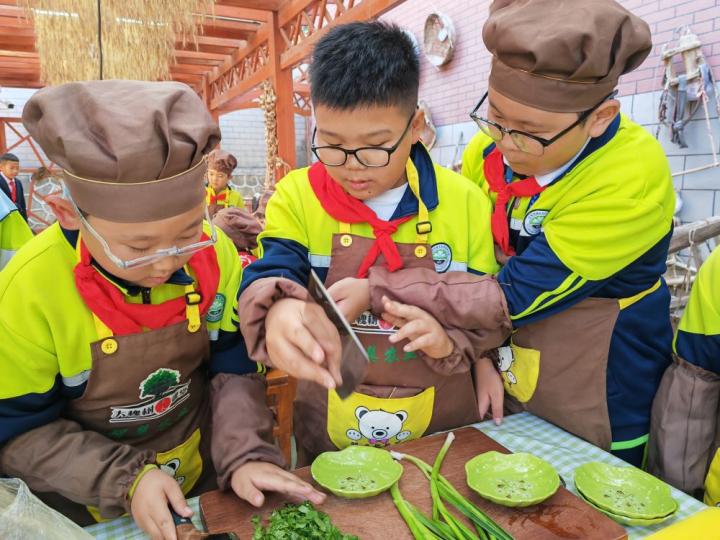 蘭州市城關區(qū)伏龍坪小學六年級1班的裴玉龍(左一)和同學們動手嘗試切蒜苗。新華社記者 白麗萍 攝